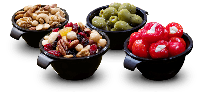 Assortiment van verse nootjesmix, olijfjes en kaasblokjes. Bovenstaande prijs is per persoon inclusief 9% BTW. Prijs vanaf 10 personen.